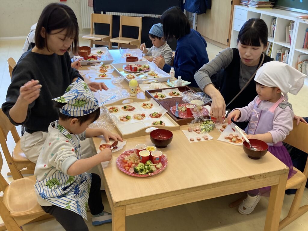 年少児は親子でピザ作り!ソーセージを切ったり、ブロッコリーの房取りをしたりしたあと、生地の上に好きな具材を載せて、美味しいピザが焼きあがりました。